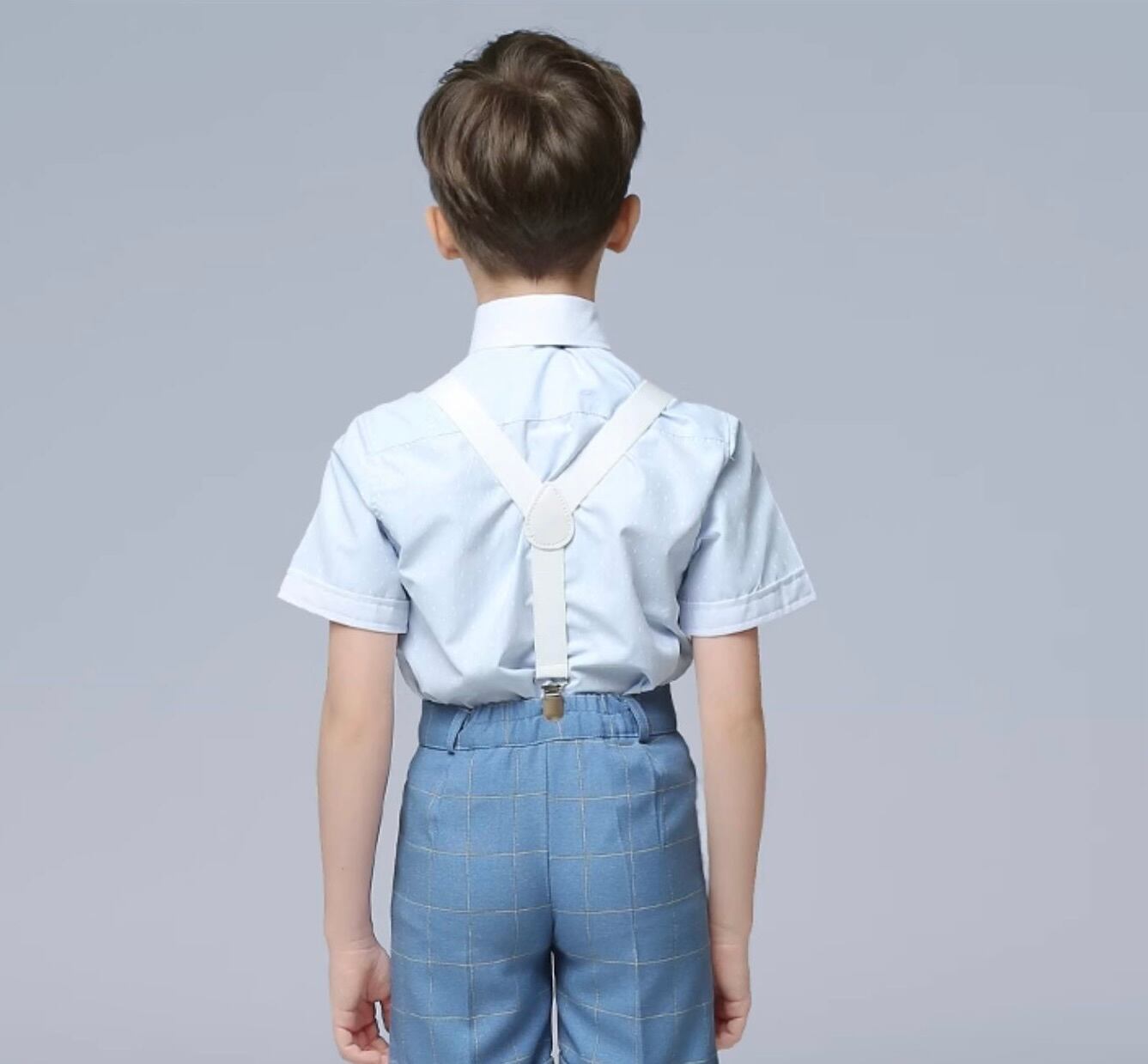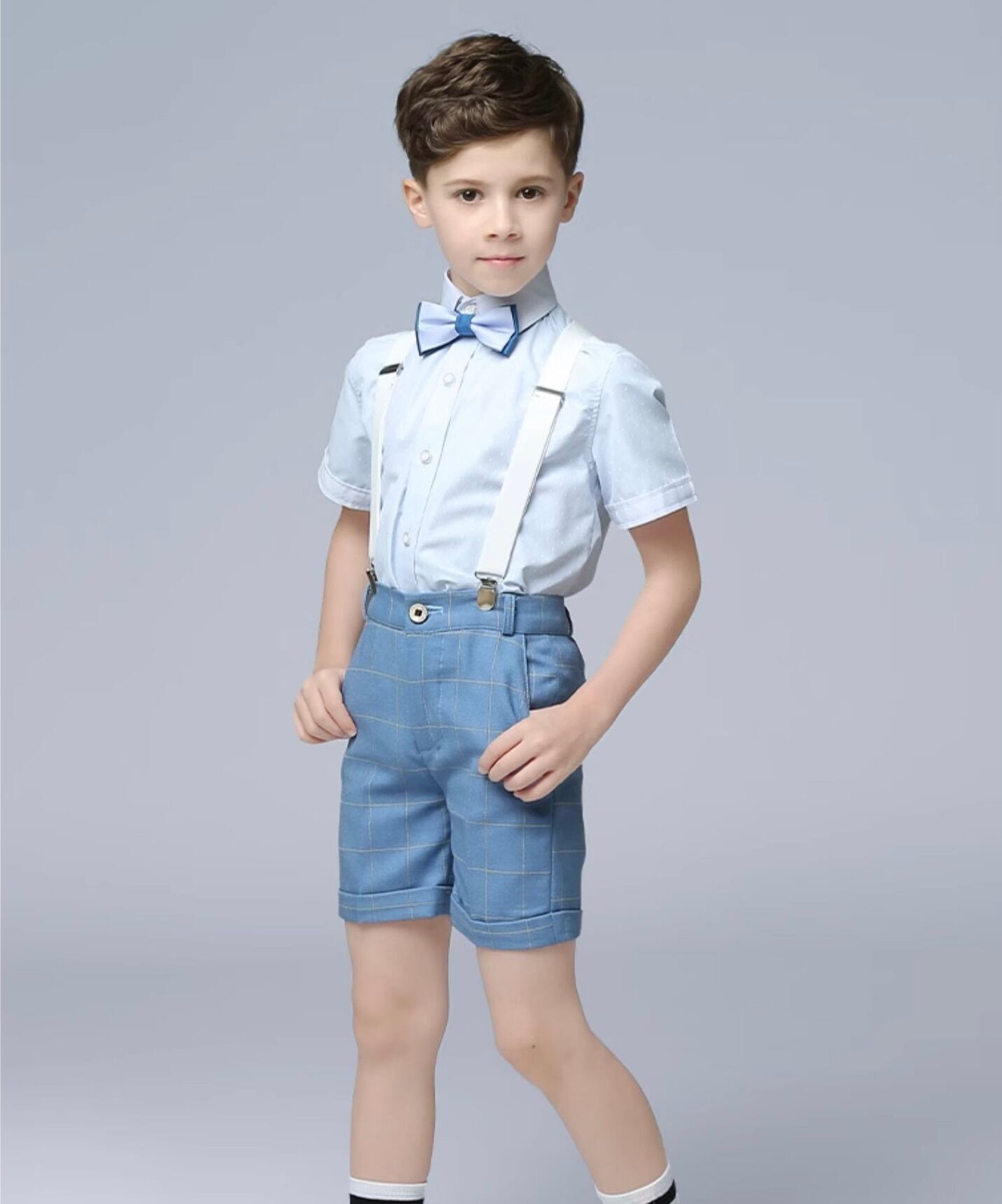 爽やかなブルーのチェックパンツに、ホワイト×ライトブルーのシャツが映える、夏にぴったりの男の子フォーマルセット。