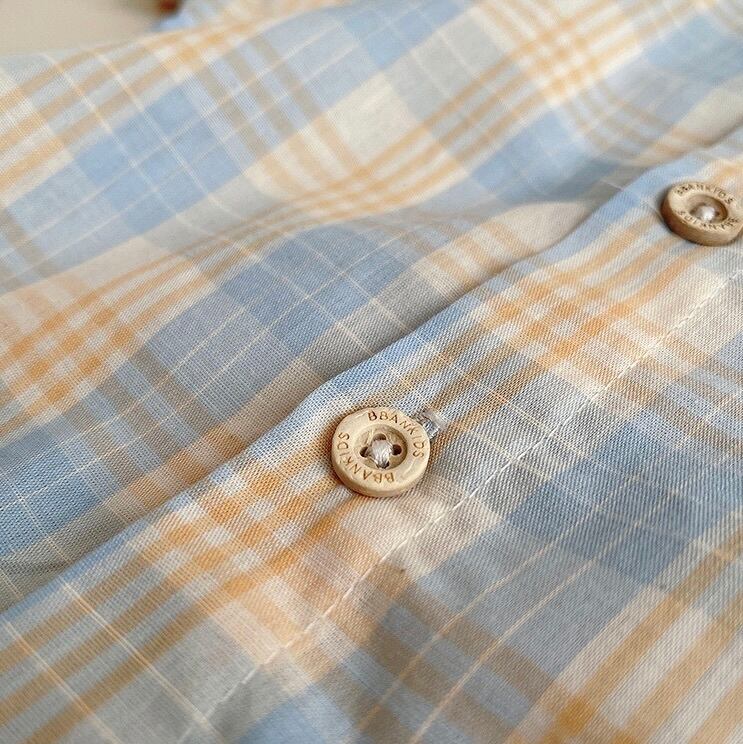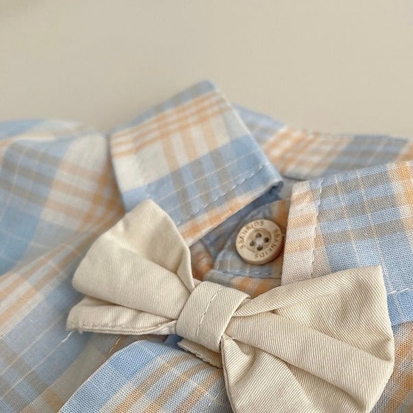 水色×ベージュのチェック柄が爽やかで優しい印象の半袖シャツに、胸元にはちょこんとリボンとくまさんのワッペン。