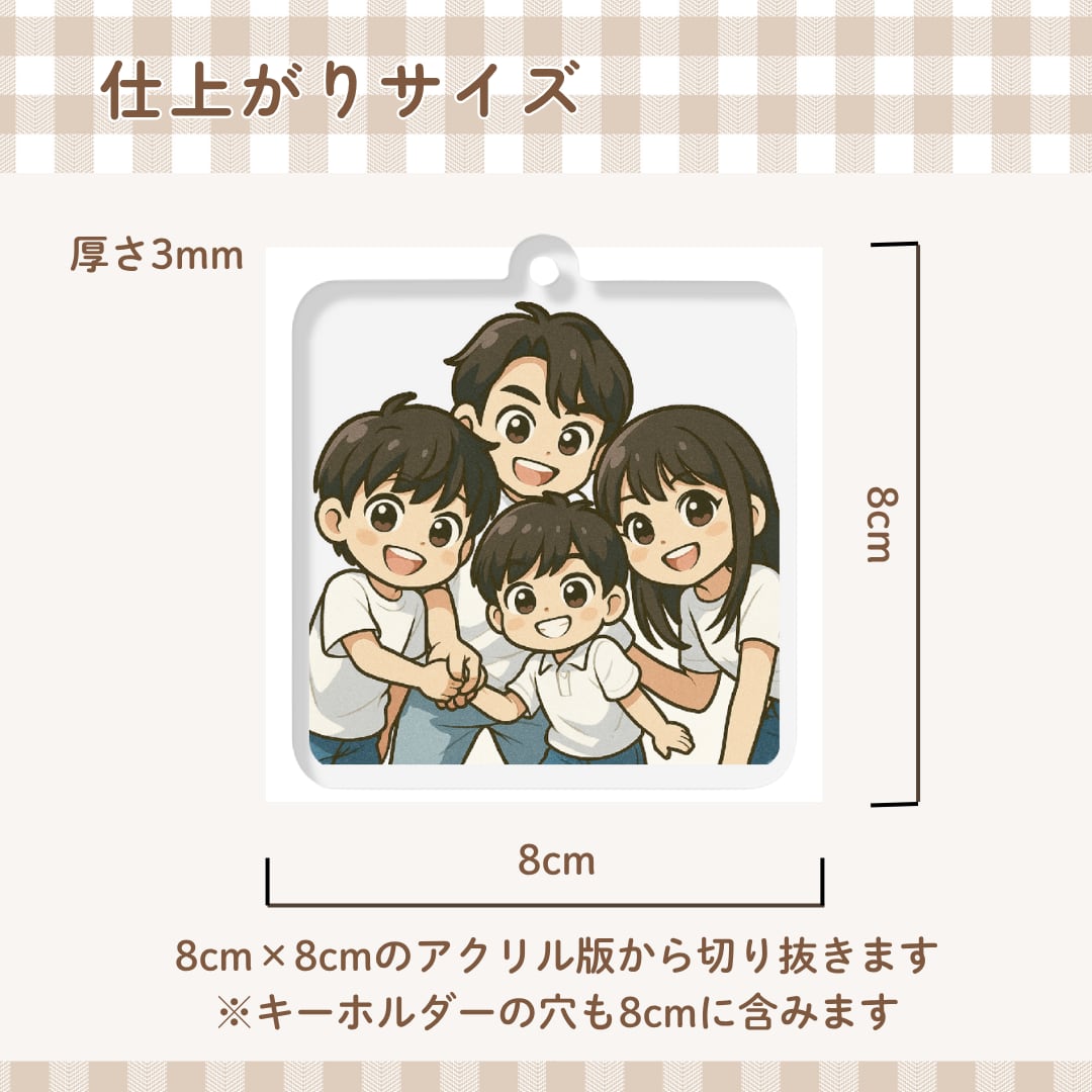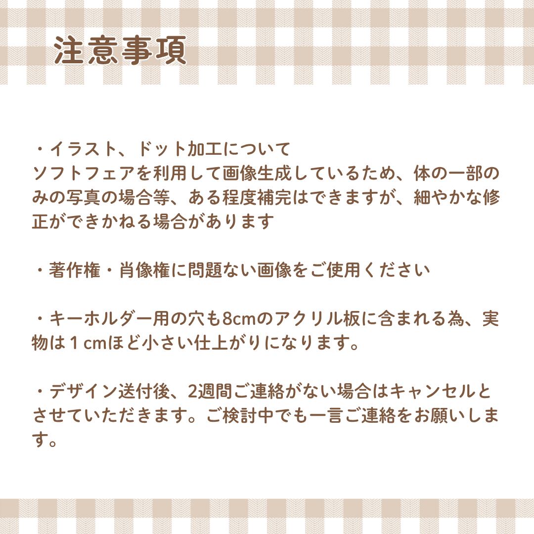 ・キーホルダーの穴も8cmのアクリル板に含まれる為、実物は1cmほど小さい仕上がりになります。