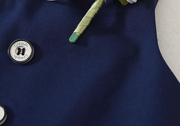 ふんわりやさしい白シャツに、深みのある紺色ベストとハーフパンツを合わせた、ちょっと特別な日のためのセット。