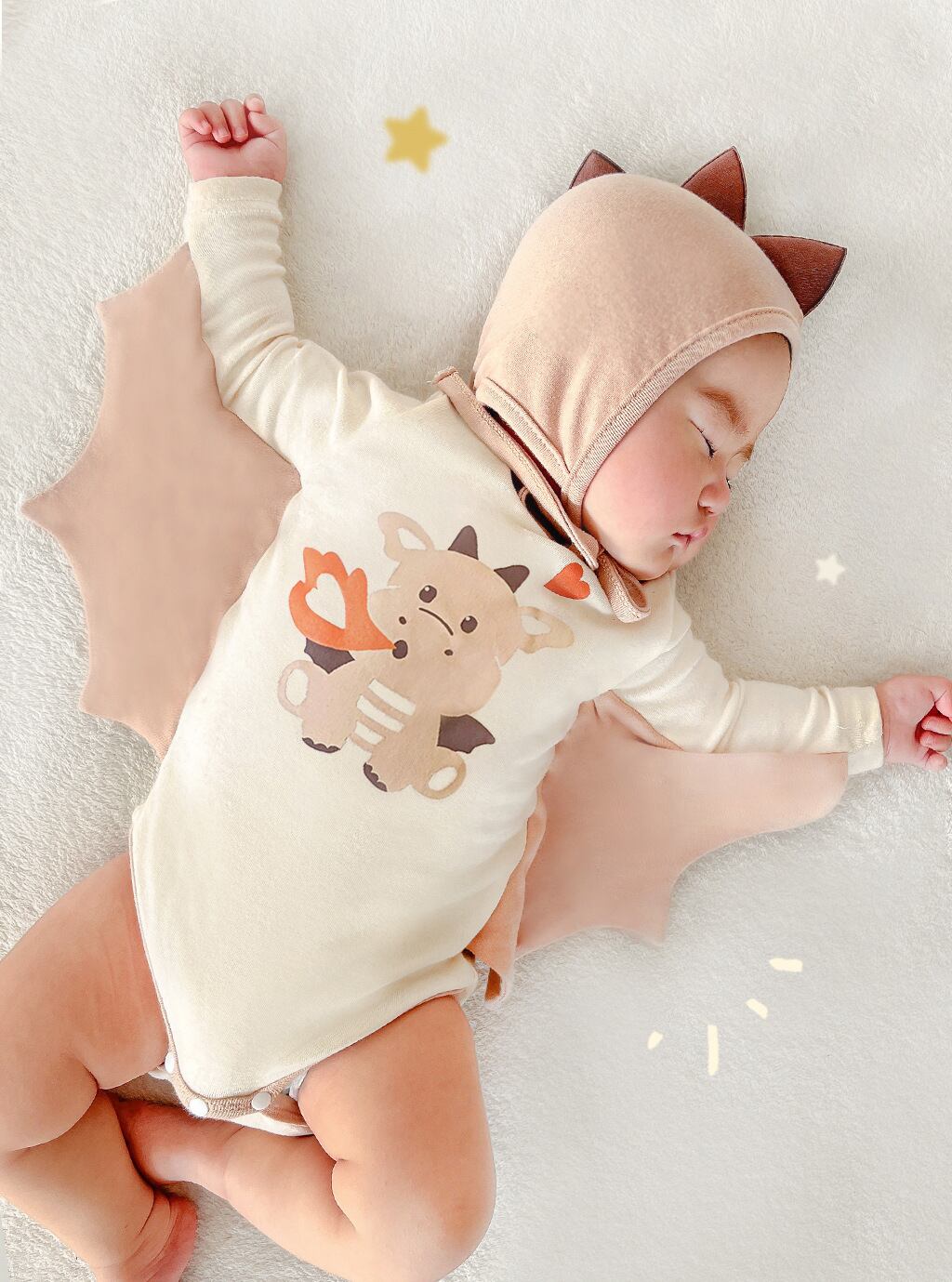 ロンパースに羽根つきケープととんがりフードがセットになっており、