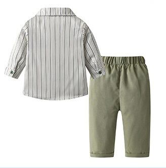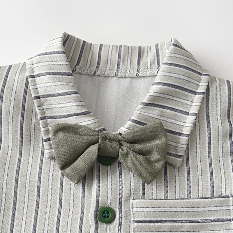 ストライプのシャツには同系色のボタンと蝶ネクタイをあしらい、