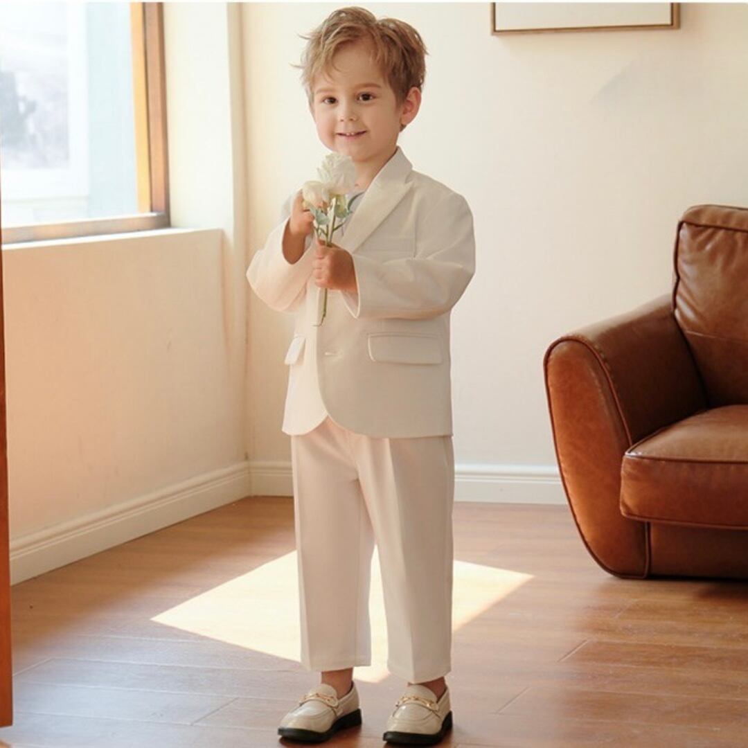 やさしい色合いと端正なシルエットが魅力のキッズ用セットアップスーツ。