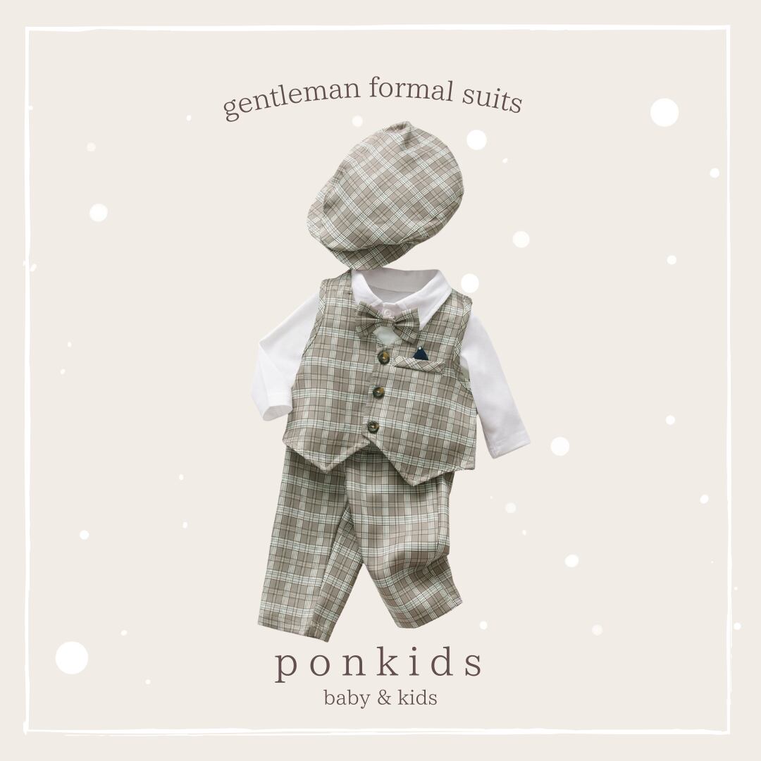 ベスト・パンツ・シャツ・蝶ネクタイ・ハンチング帽が揃ったフォーマルセットです。