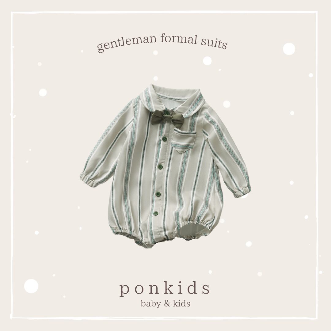 おしゃれなストライプ柄がポイントの、フォーマルロンパースです。