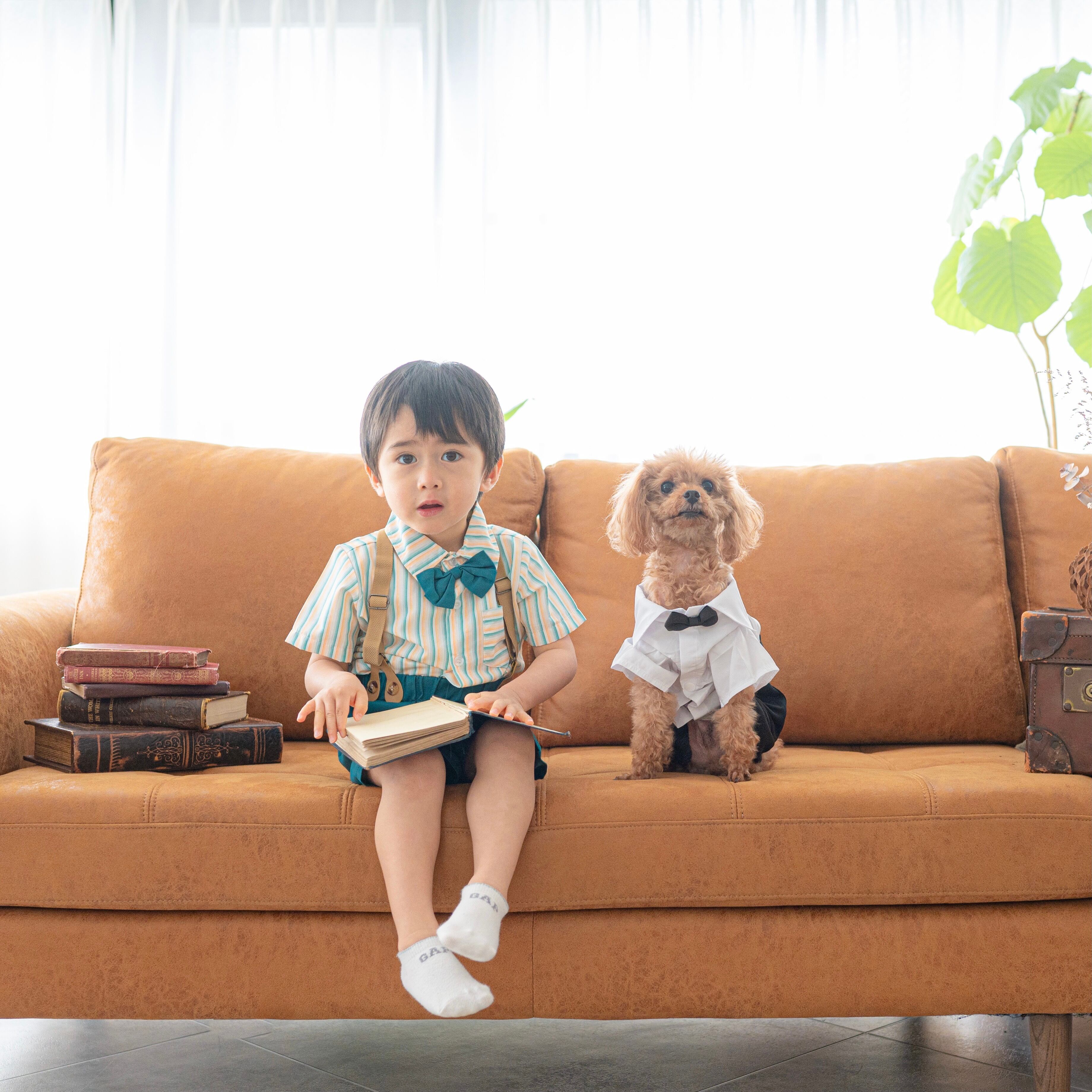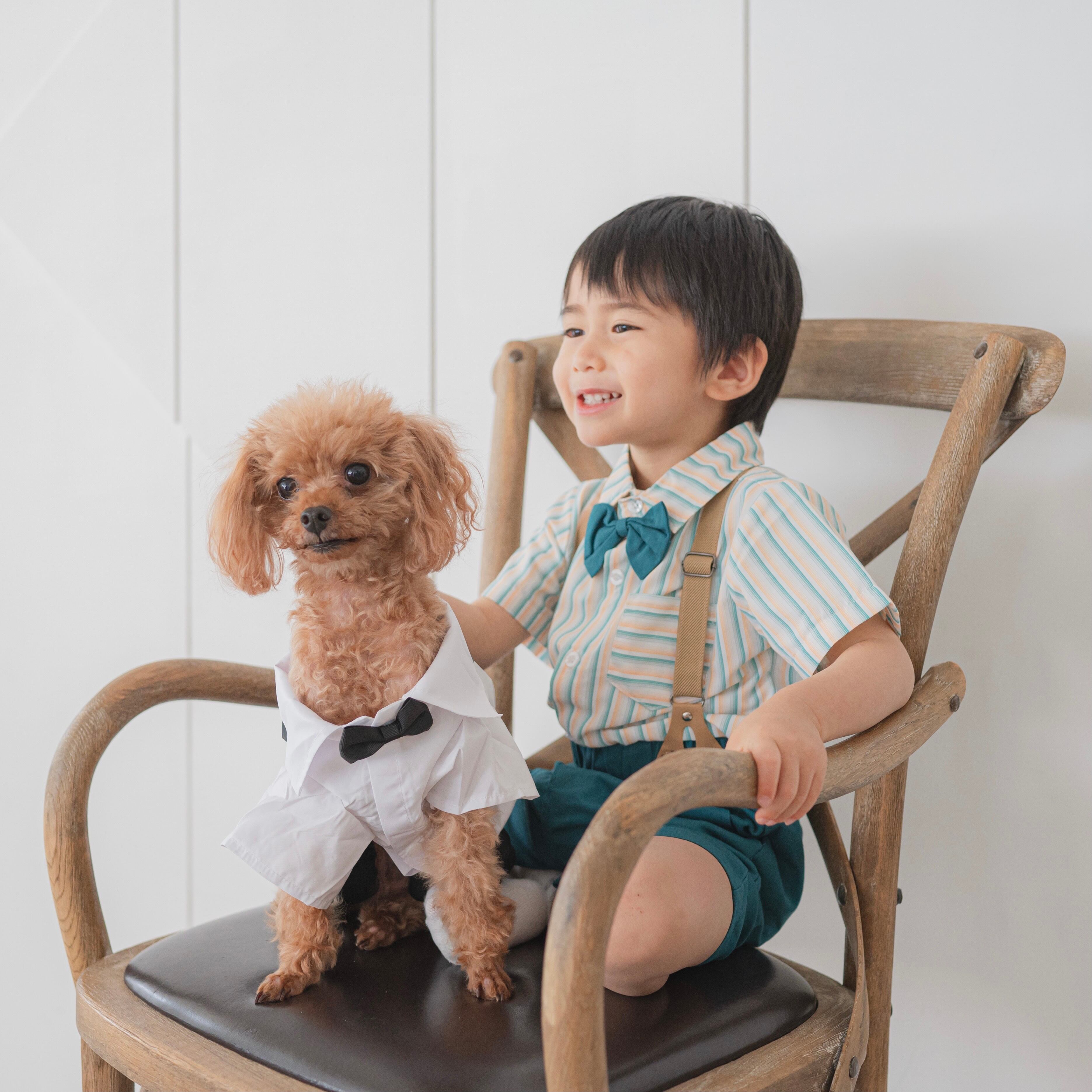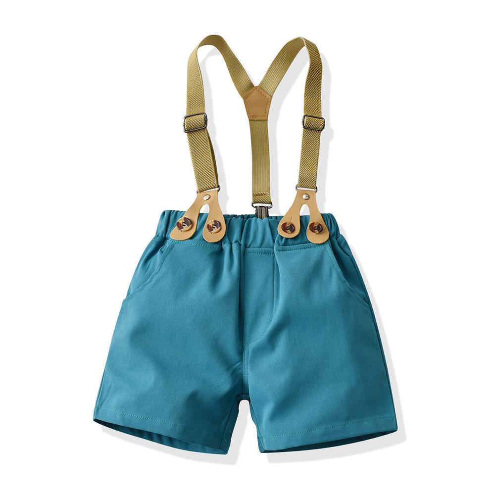 シャツ、蝶ネクタイ、サスペンダー、パンツのセットです。