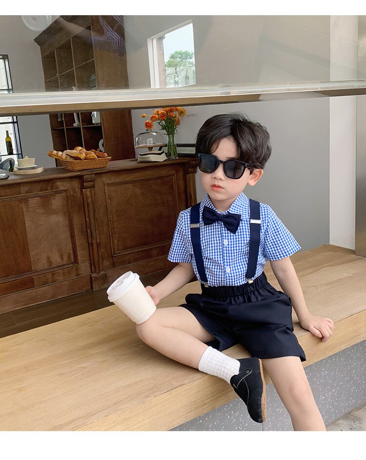 蝶ネクタイ、シャツ、サスペンダー、パンツ