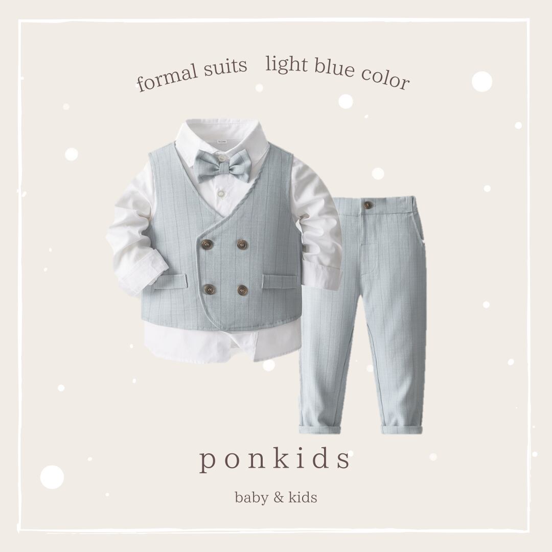 男の子の特別な瞬間にぴったりのフォーマルスーツが新登場!ライトブルーの優しい色合いは、お子様に可愛らしさを引き立ててくれます。結婚式や入園式、発表会など、様々なフォーマルシーンで大活躍のこのスーツは、おしゃれで自信を持って着こなせること間違いなし♬