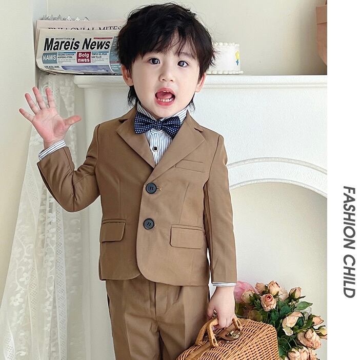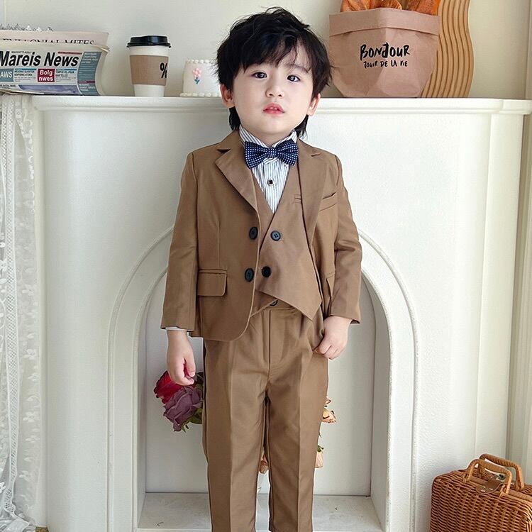 アシンメトリーなベストが印象的な、こだわりのフォーマルスタイル。クラシックなブラウンの色味が高級感を演出し、特別な日の装いにぴったりな一着です。