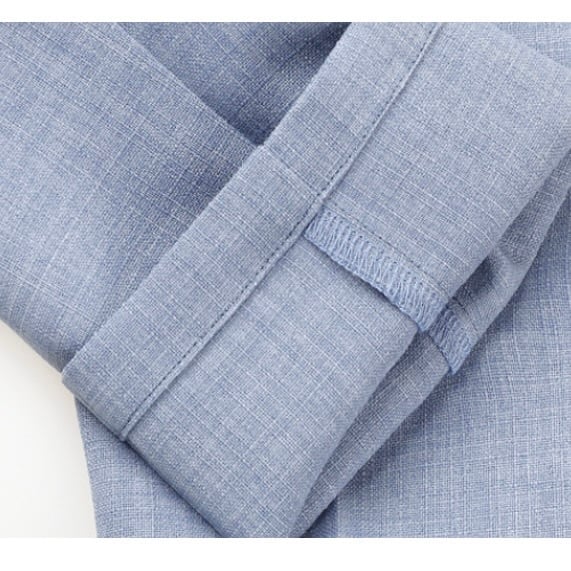 柔らかな水色に、襟元の白ラインがアクセント。爽やかで端正な印象を与え、フォーマルな場面にぴったりの一着です。